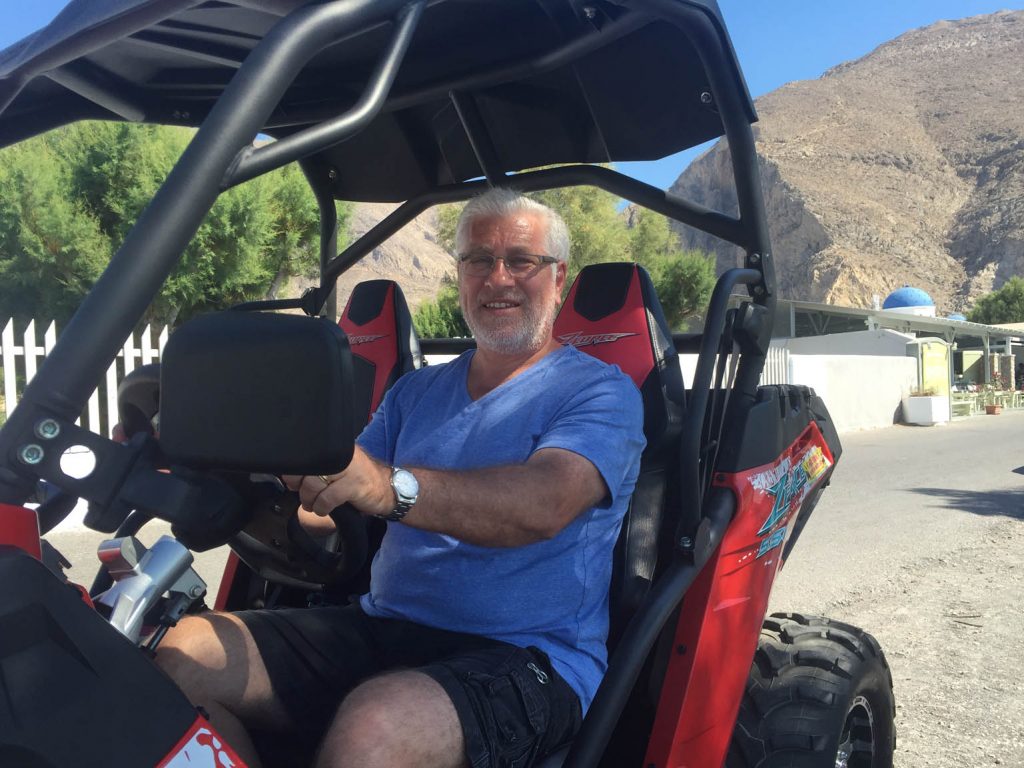 Thera is where the best shopping is, they tend to inflate the prices just a little in Oia which is the most popular location on Santorini. More on that later. We wanted to rent a quad bike to get around and see a bit of the island so within 50 metres of the top of the Gondola was a quad bike rental company. They convinced us to upgrade (or course) to a buggy as it was safer to ride if your inexperienced on quad bikes. I’m glad that we did because it was very hot and the buggies have a roof which helped shelter us from the screaming sun. Also the buggy has two side by side seats so much more comfortable for the passenger.